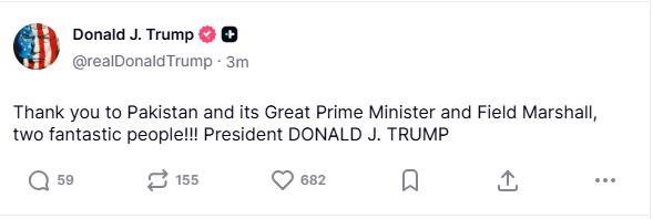امریکی صدر ڈونلڈ ٹرمپ نے اپنے سوشل میڈیا ٹروتھ پر بیان میں کہا پاکستان ، عظیم پاکستانی وزیر اعظم شہباز شریف اور فیلڈ مارشل سید عاصم منیر کا شکریہ ادا کیا۔
